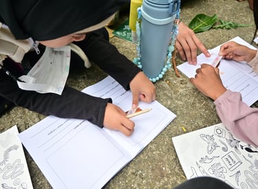 Kreasi seru dengan bahan alami — membuat kolase daun, bookmark, hingga lukisan stempel. Anak-anak belajar kreativitas, ketelitian, dan menghargai pentingnya daur ulang.